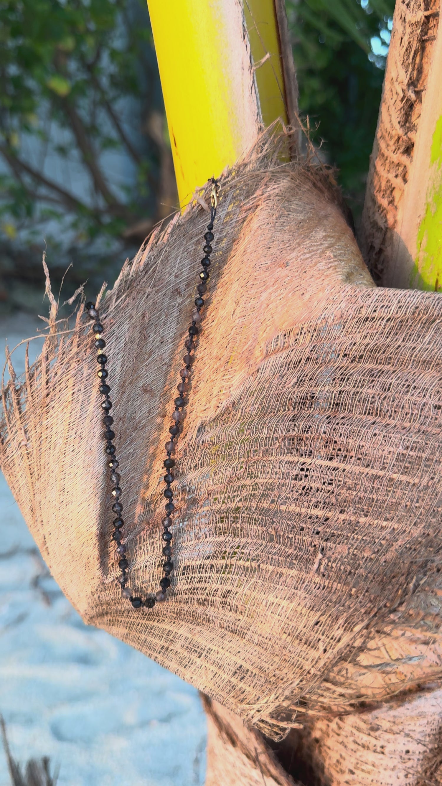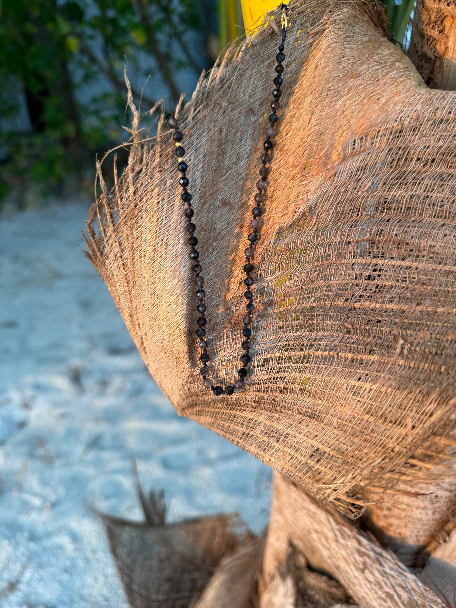 Przepiękny mieniący się choker z kwarców dymnych plecionych na czarnym bawełnianym sznurku przez artystkę. Posiada zapięcie typu karabińczyk oraz 43 cm długości. Jedyny i niepowtarzalny ze względu przede wszystkim na wyselekcjonowany rodzaj kwarców dymnych 3mm.