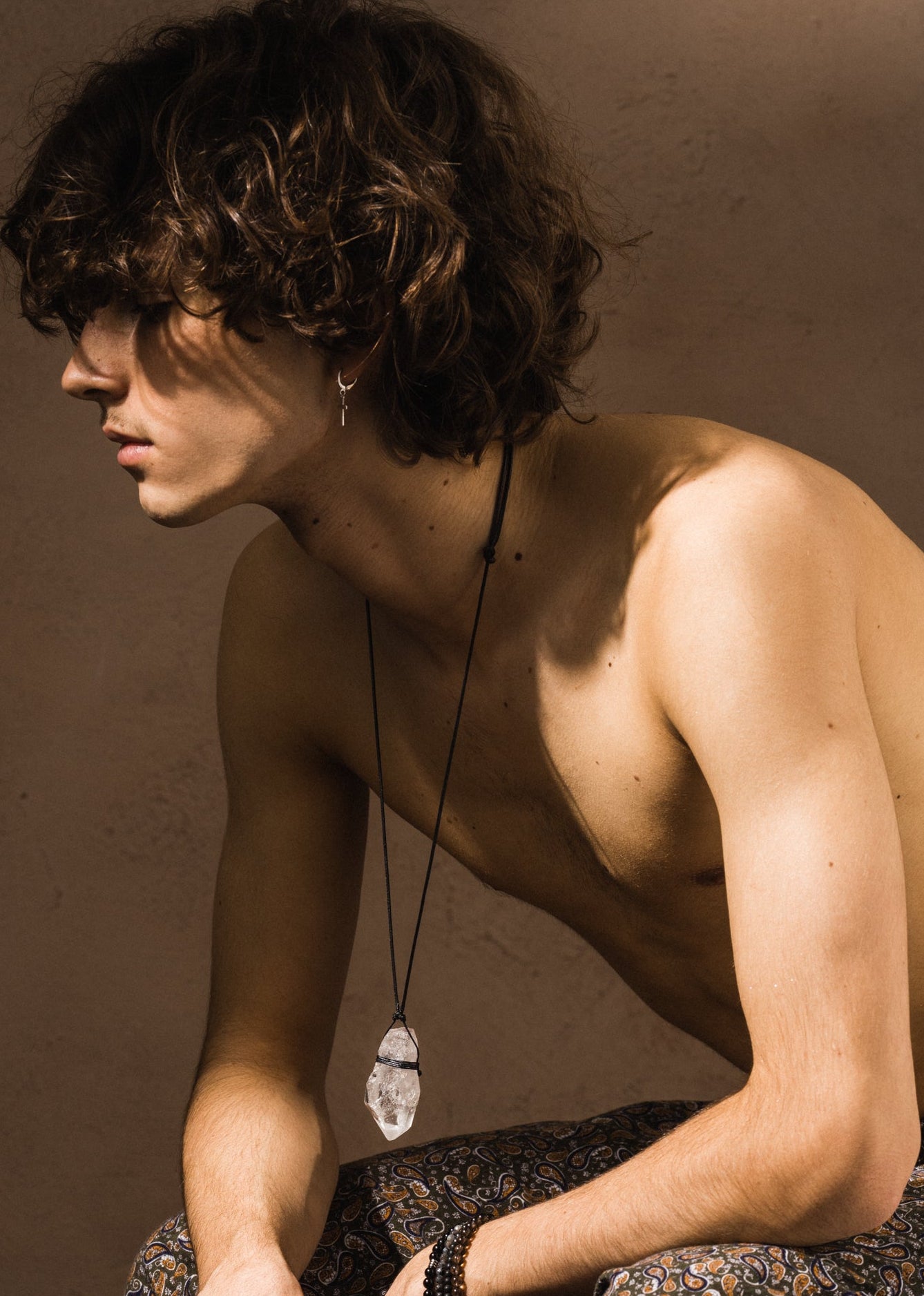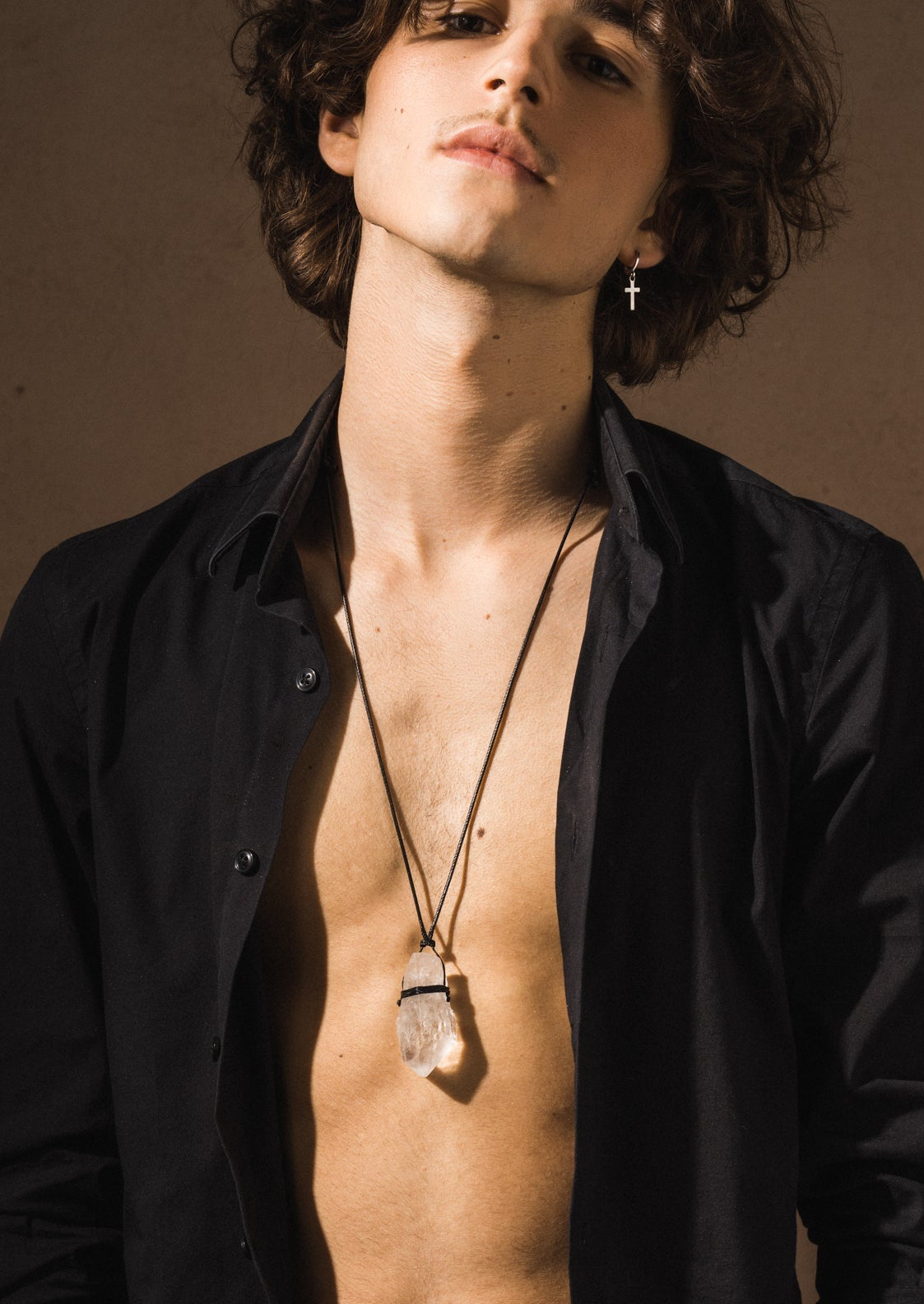 Unikalny, naturalny kryształ górski zawieszony na prostym regulowanym sznurku. Każdy kamień ma niepowtarzalny kształt i strukturę, dzięki czemu staje się jedynym w swoim rodzaju „kamieniem mocy”.