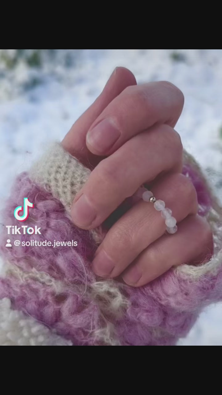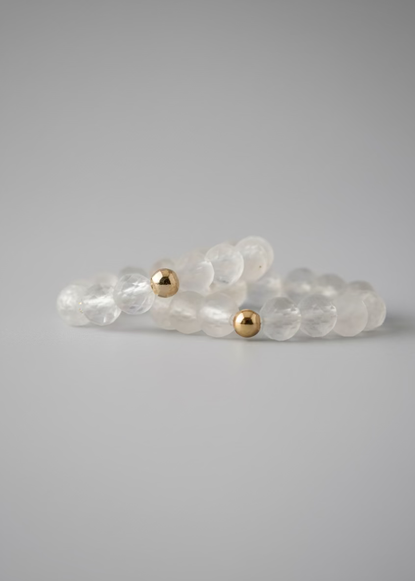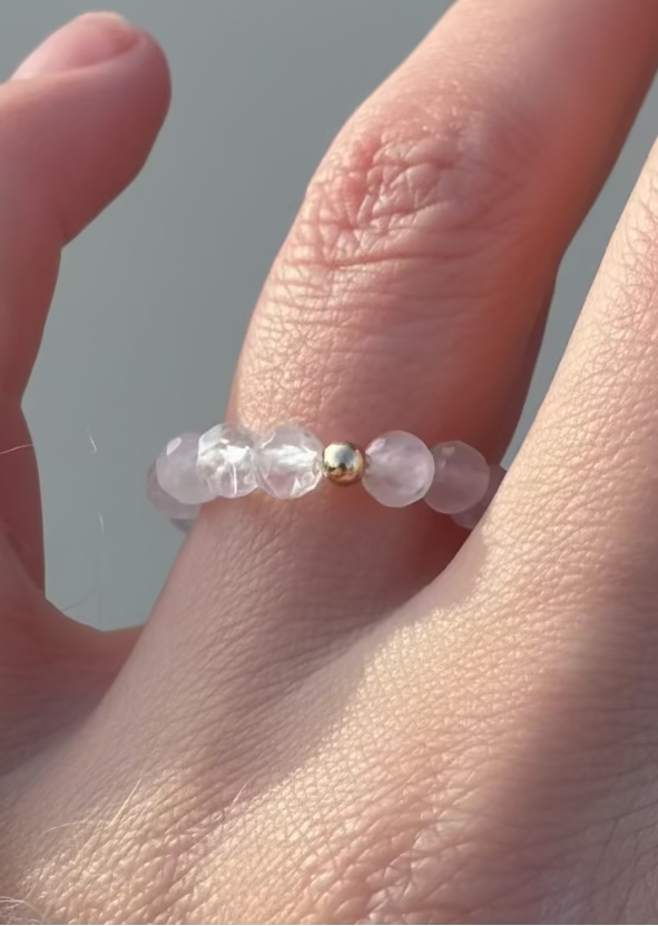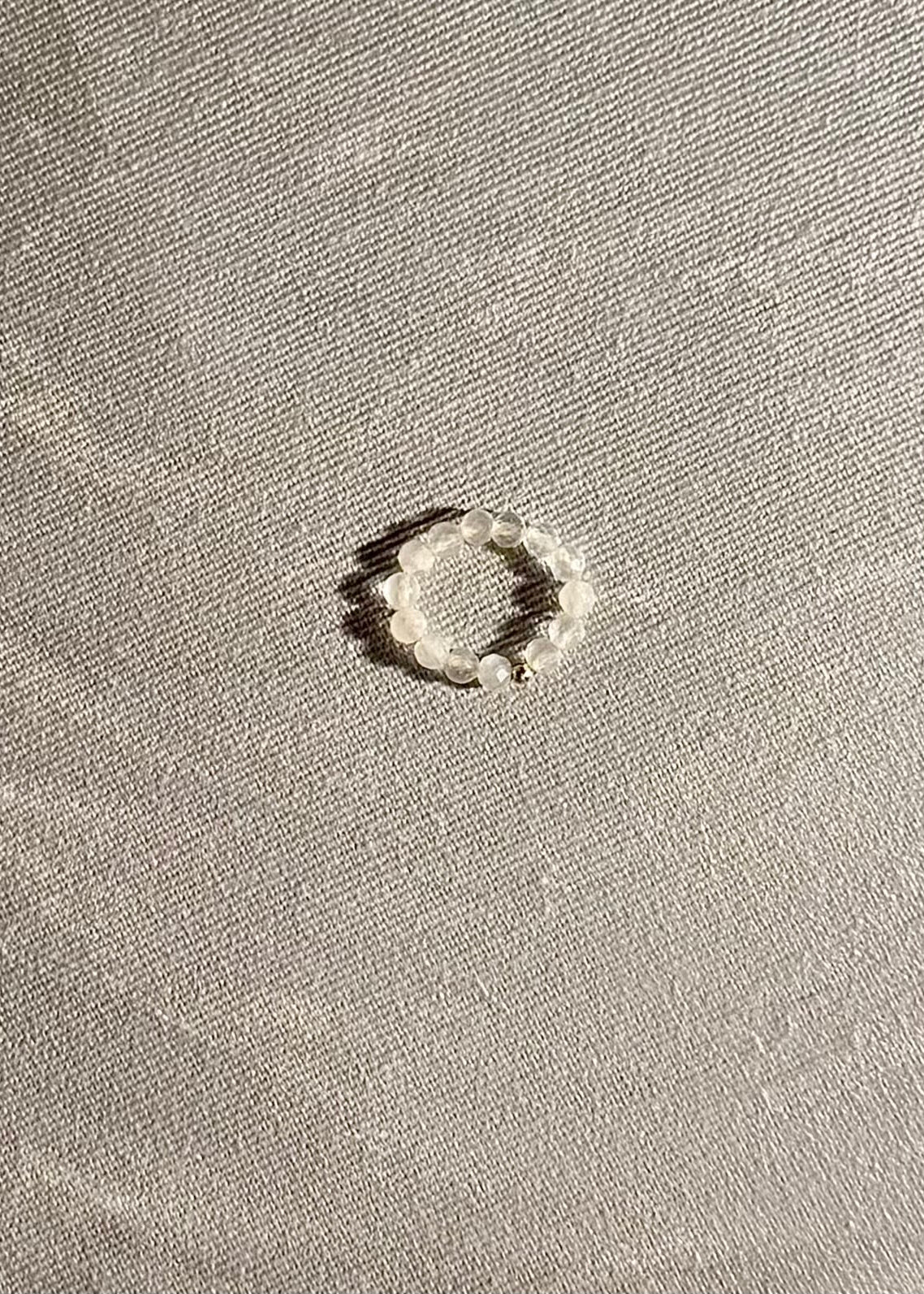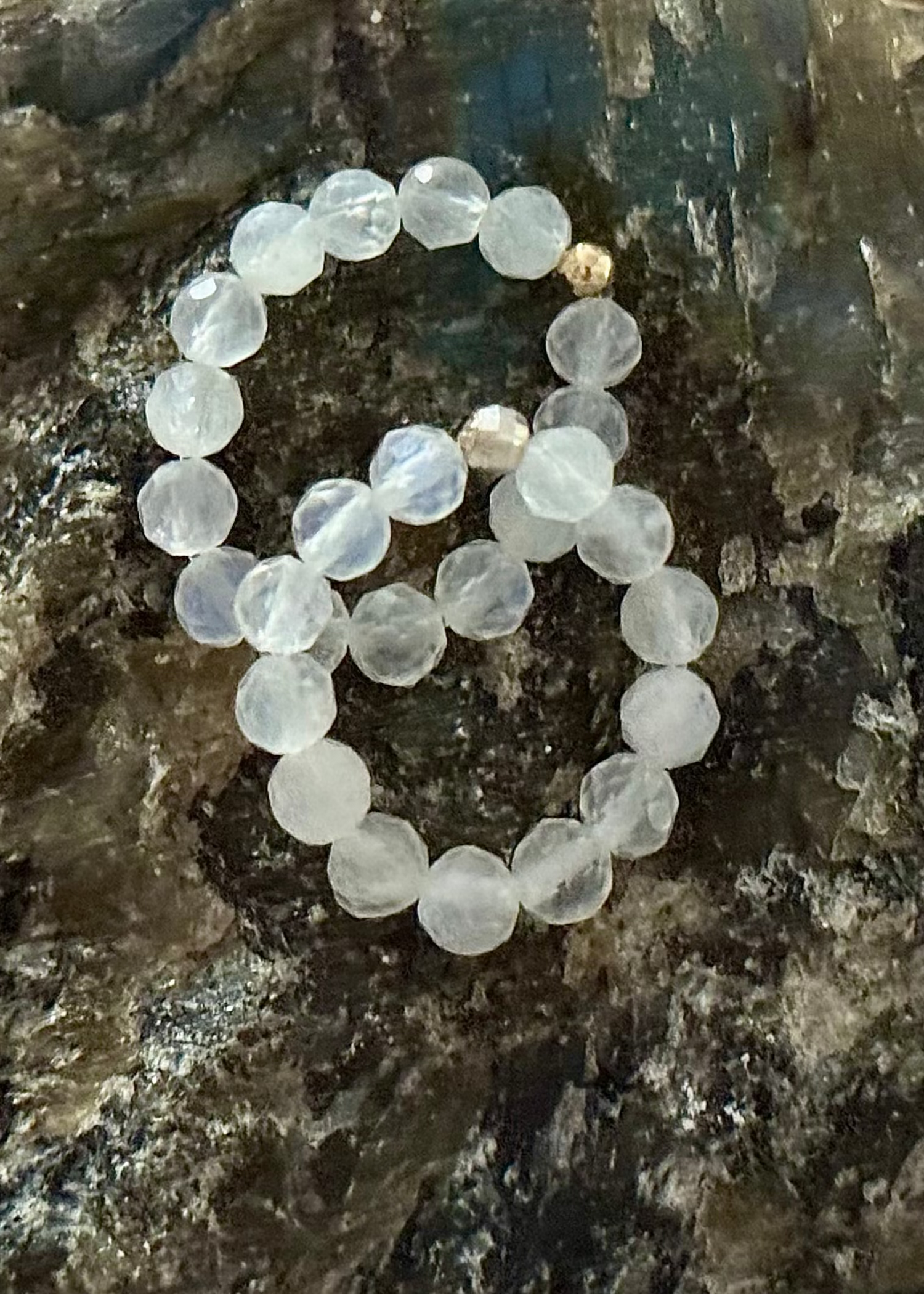 Minimalistyczny pierścionek elastyczny z białych, przejrzystych i połyskujących fasetowanych kamieni księżycowych ok. 4mm. Do wyboru kuleczka z 24k złota, srebra lub pozłacanego 24k złotem srebra.