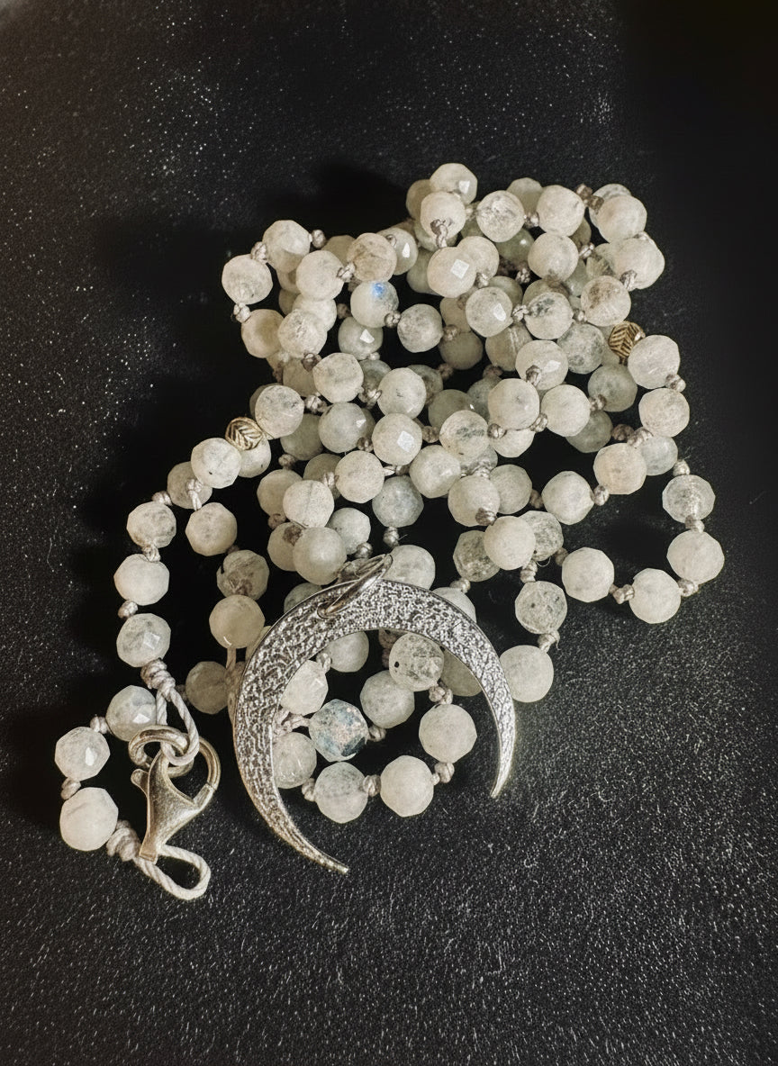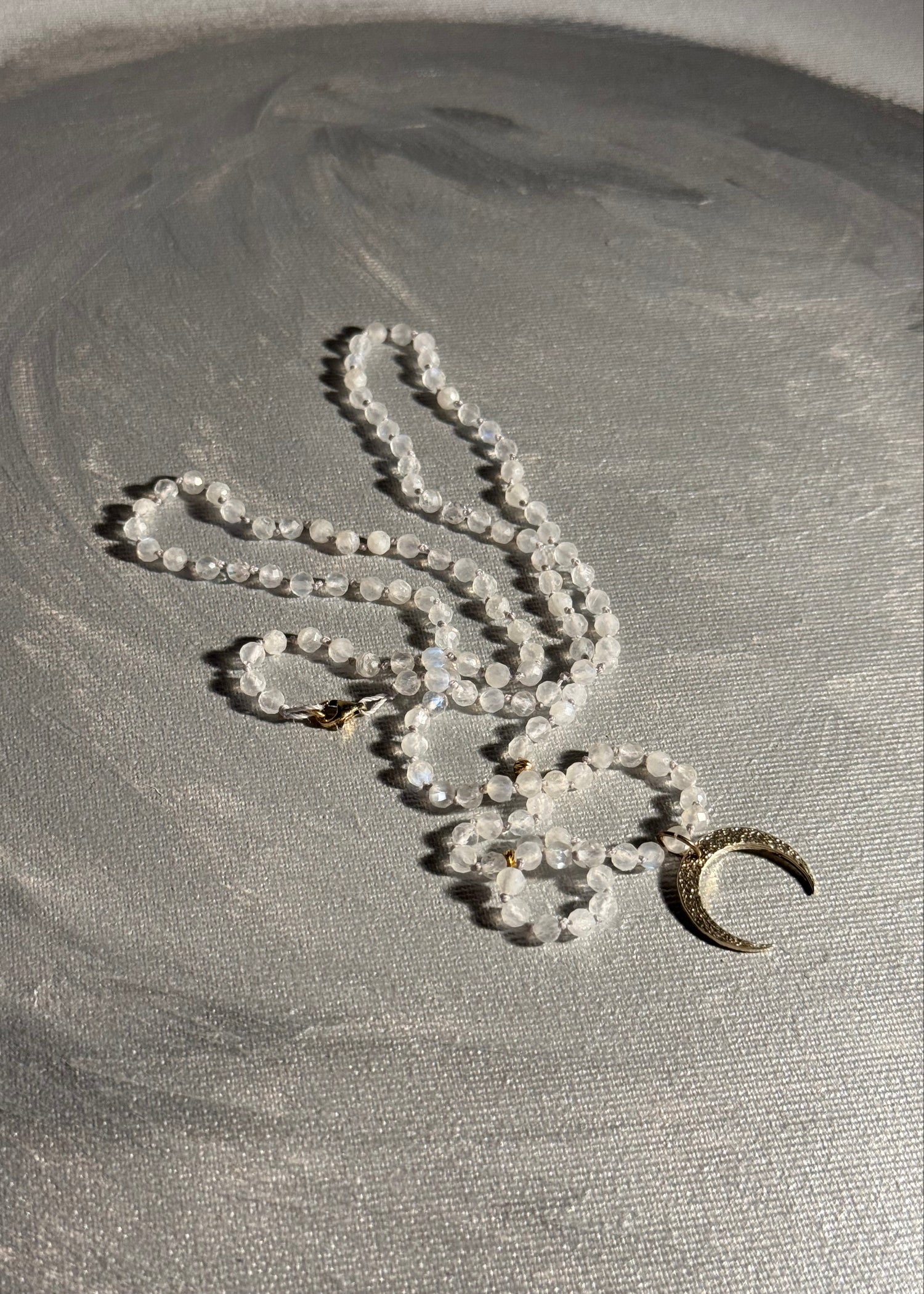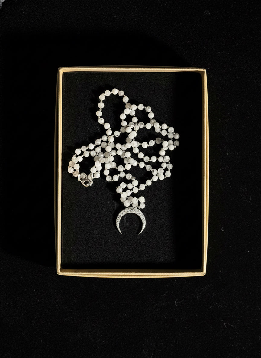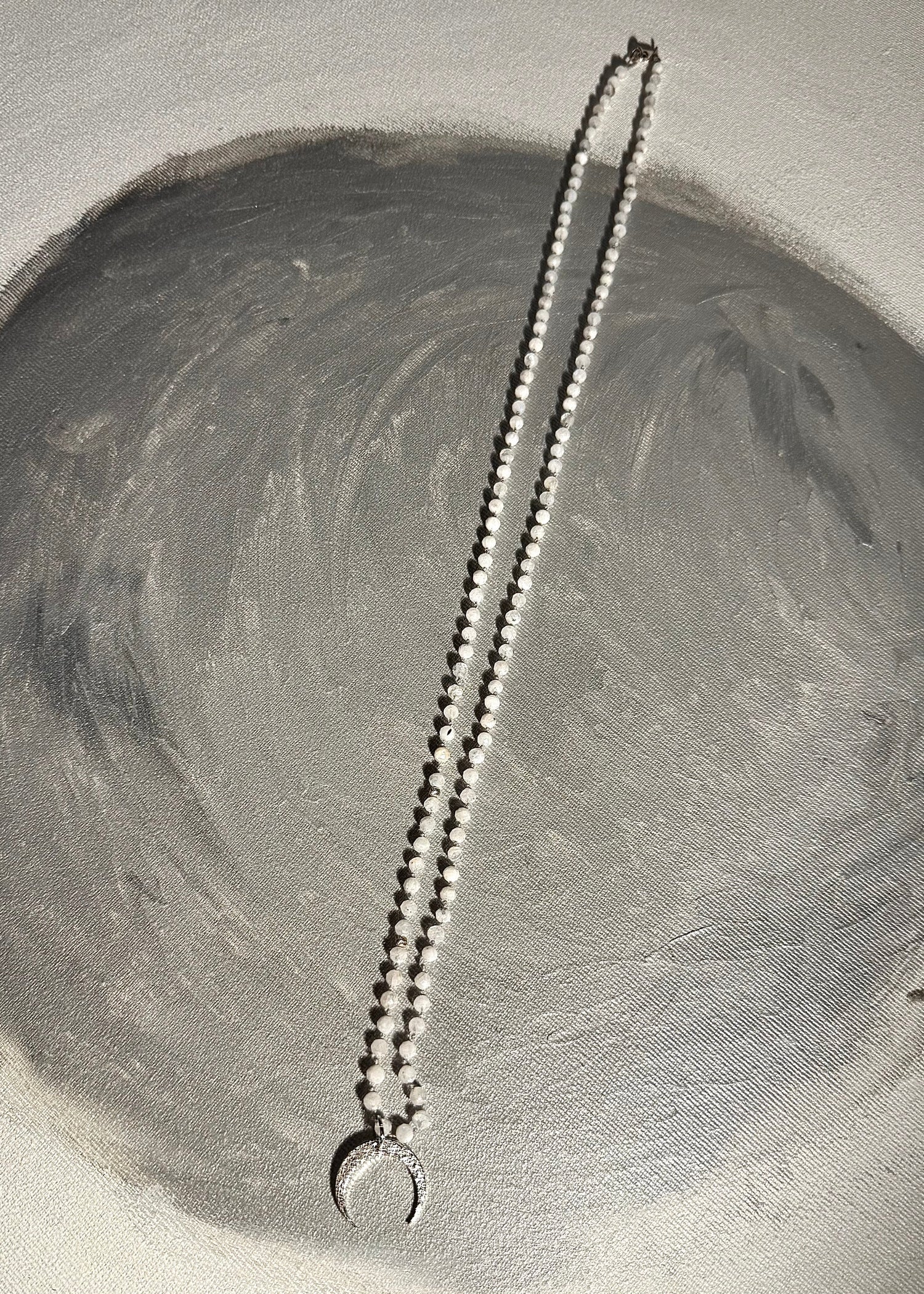 Długi naszyjnik z kamieni księżycowych. Bardzo subtelny. Wykonany z fasetowanych 4mm półprzezroczystych i pięknie mieniących się kamieni. Posiada zapięcie z karabińczykiem, co pozwala na stylizację w formie chokera. Naszyjnik ma 75 cm długości i jest limitowany. Idealnie sprawdzi się dla kobiety ceniącej minimalistyczną biżuterię.