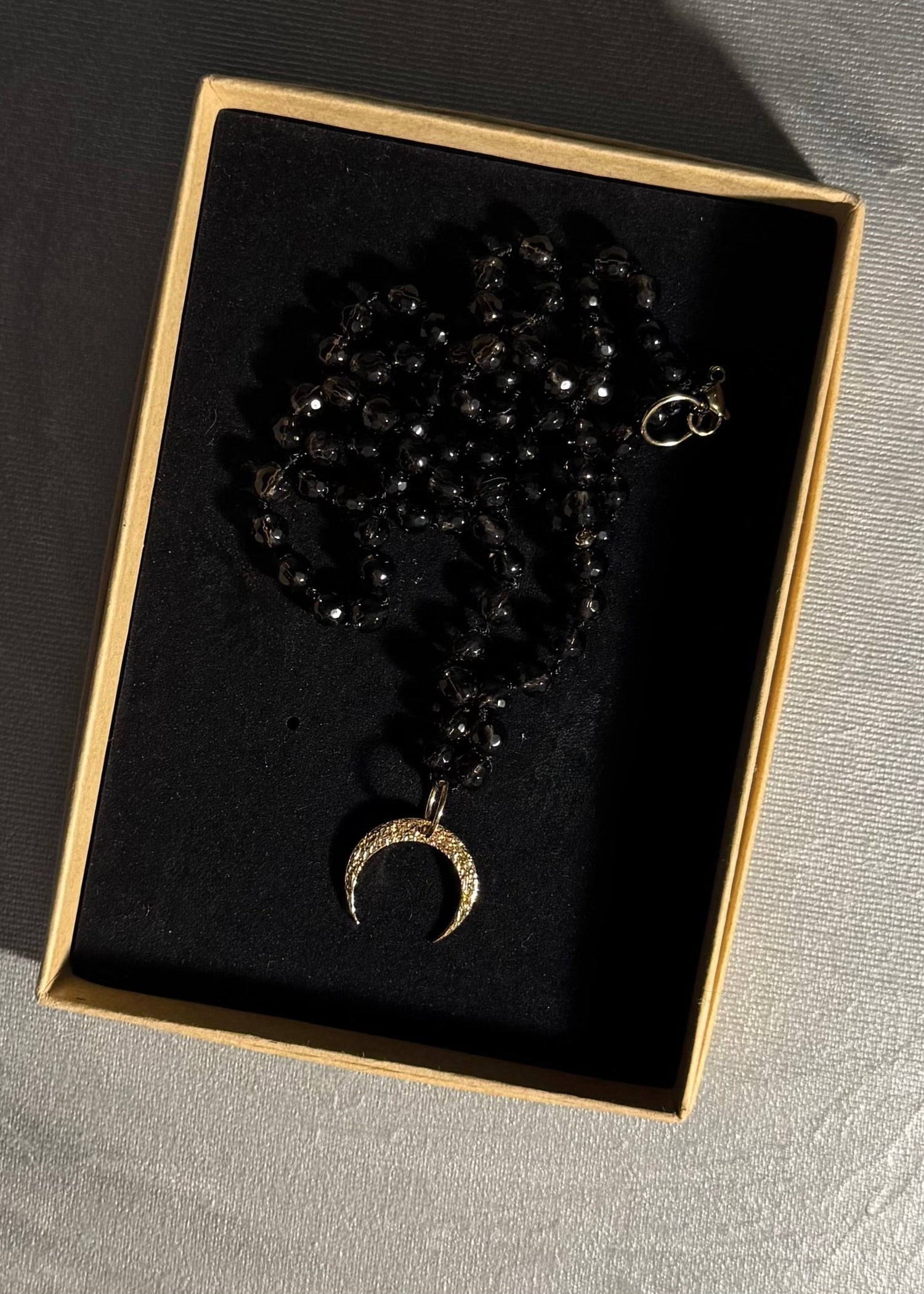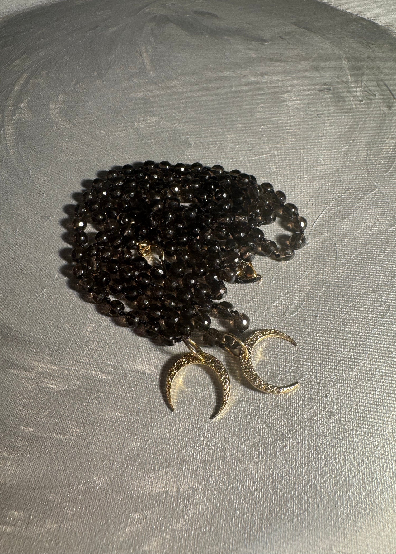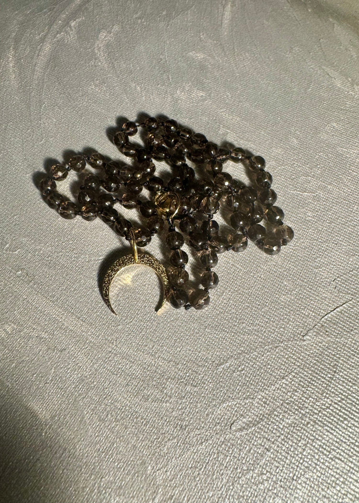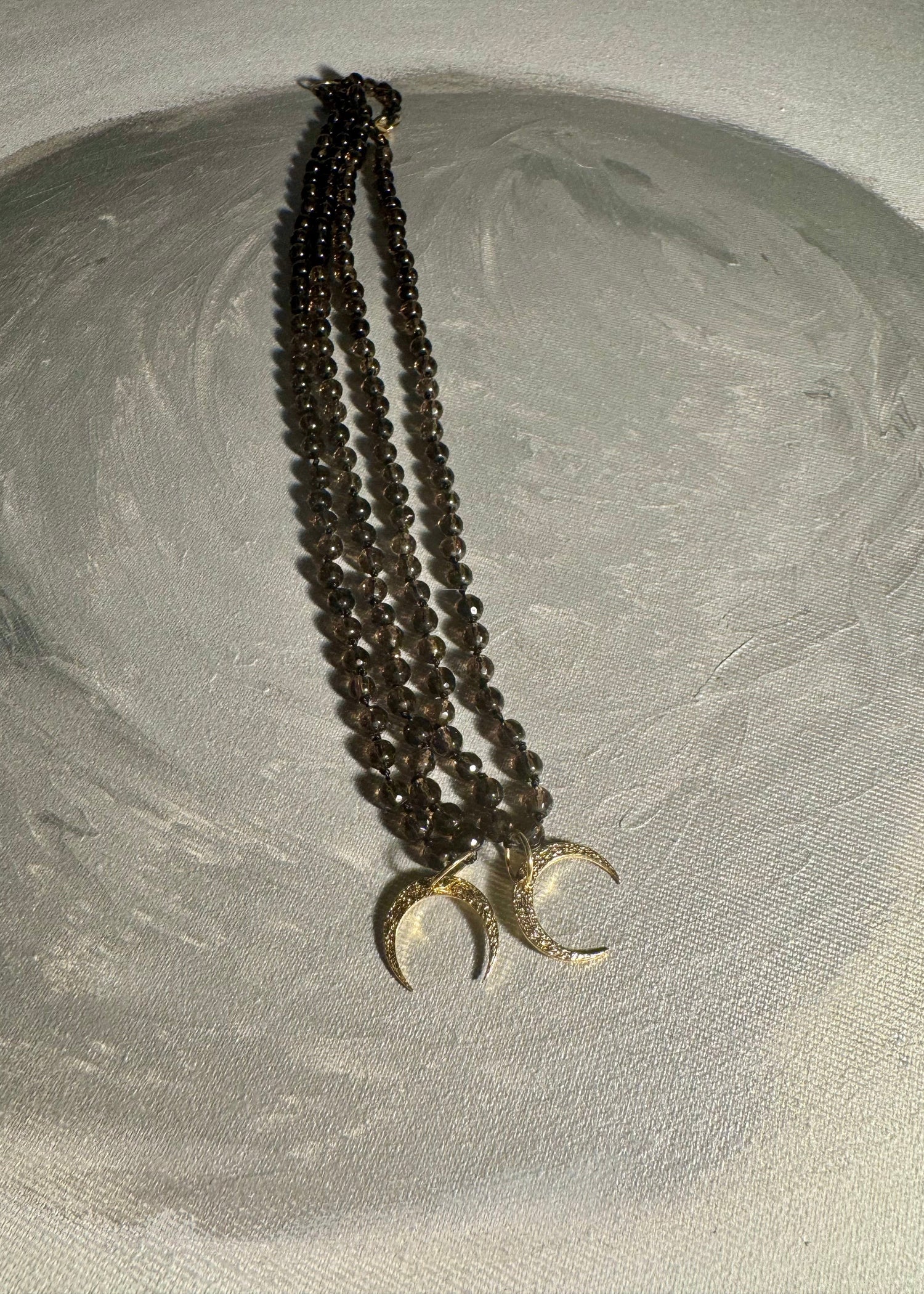 Przepiękny naszyjnik pleciony własnoręcznie przez artystkę z kwarców dymnych 55 mm z elementami srebra pozłacanego 24k złotem na zapięcie. Naszyjnik jest limitowany.
