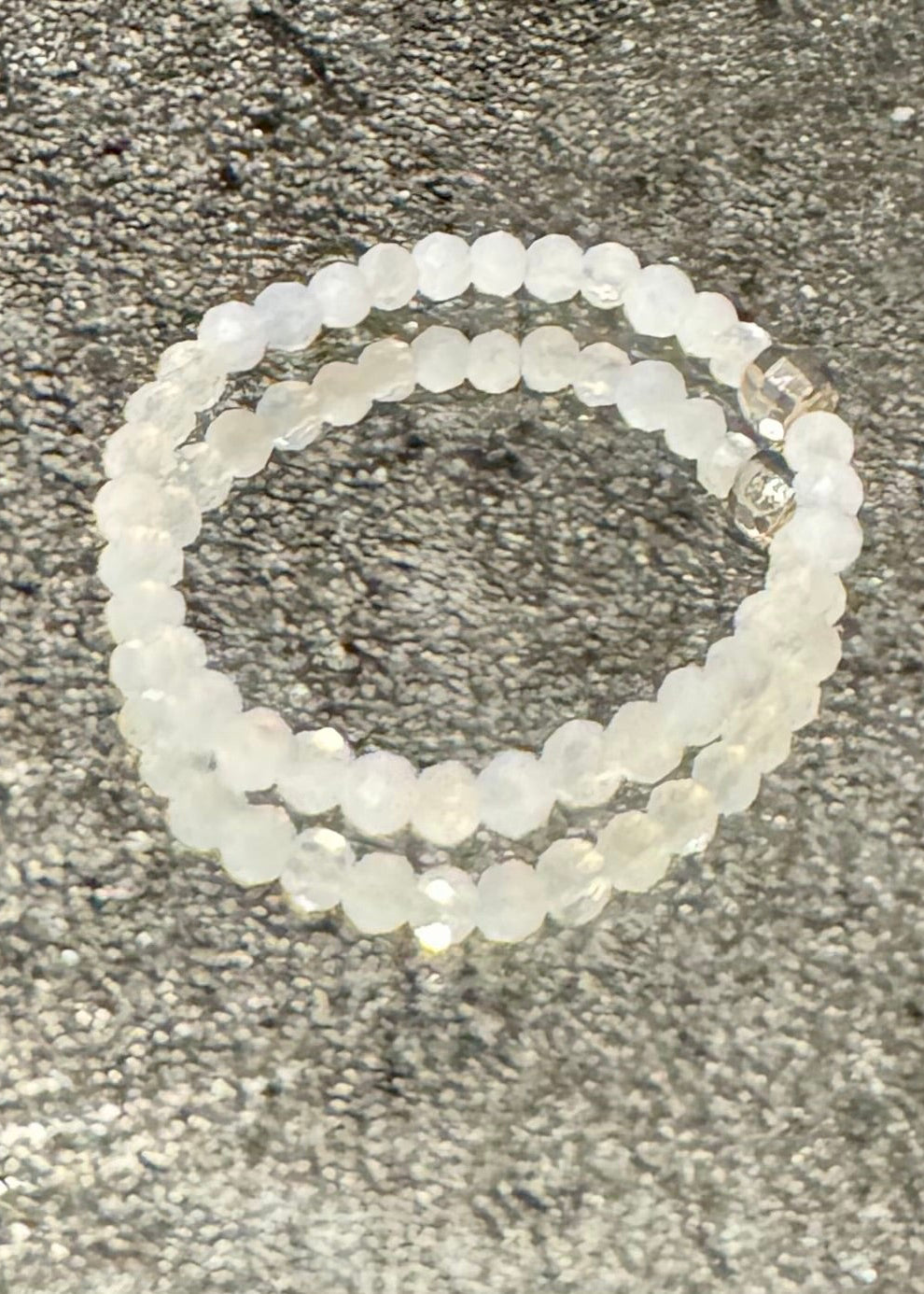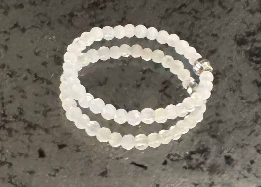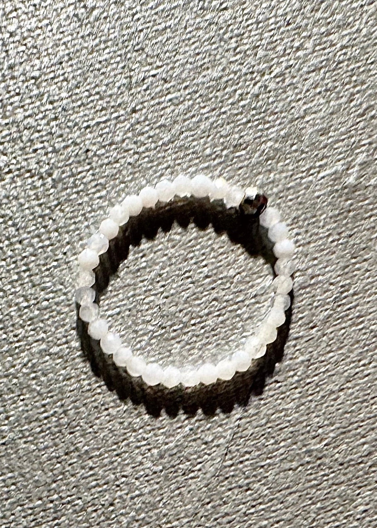 Piękny pierścionek elastyczny z drobnych kamieni księżycowych ze srebrną kuleczką. W rozmiarze M.