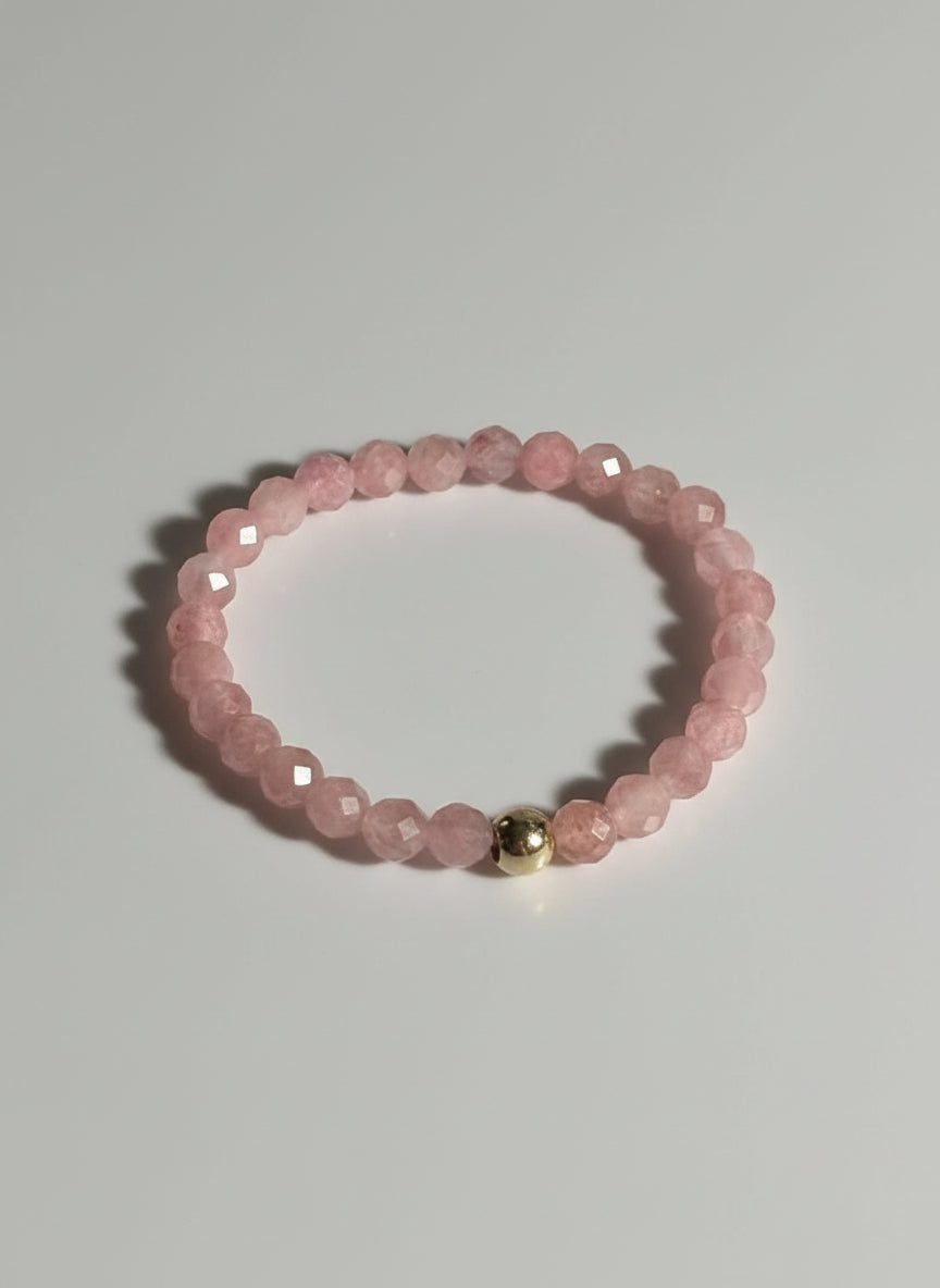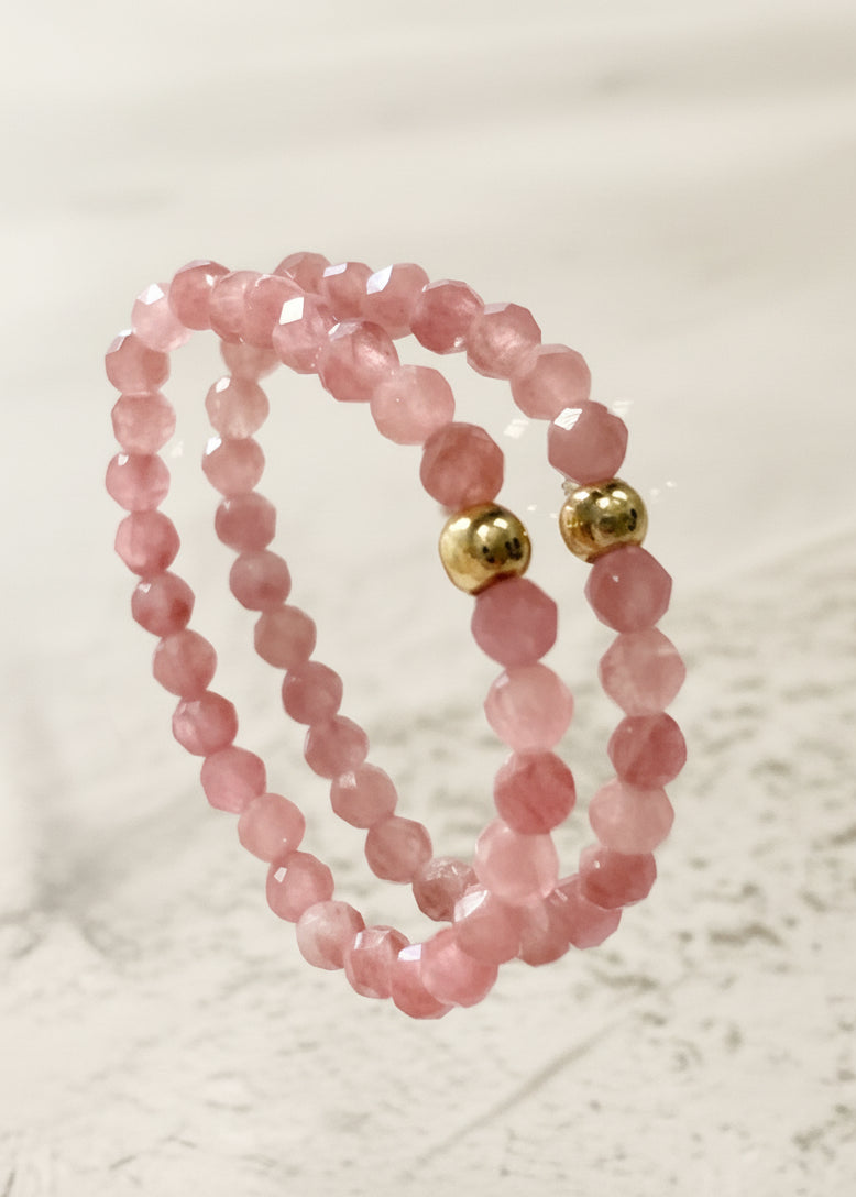 Piękny pierścionek elastyczny z drobnych rubinów z pozłacaną kuleczką. W rozmiarze S.